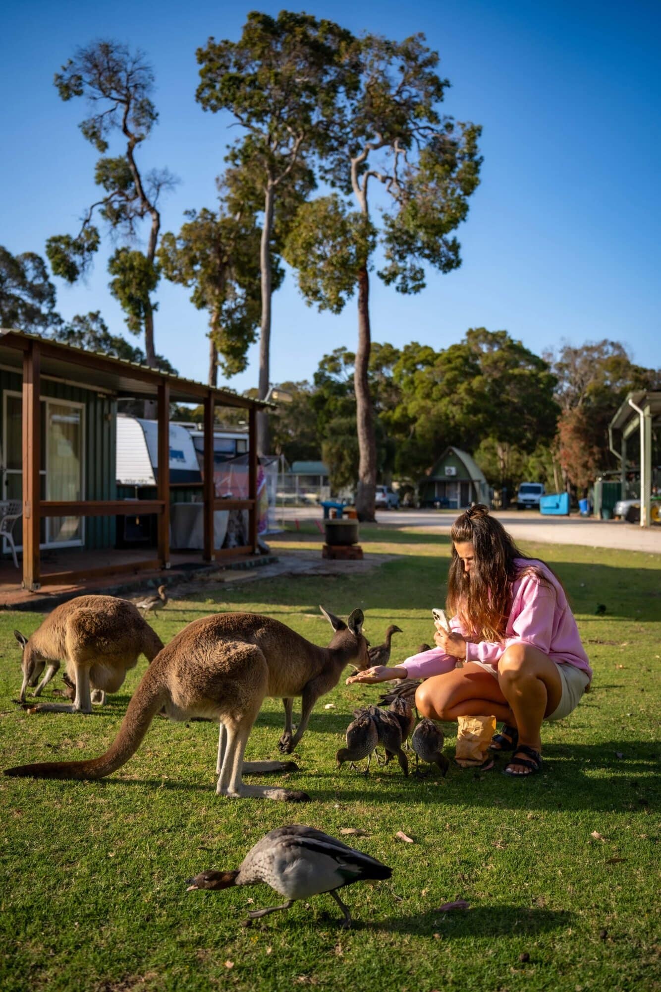 Wie bereits in dem Artikel zur Australien Westküste erwähnt, hatten wir in Margaret River einen ganz tollen Campingplatz. Denn hier gab es einige Kängurus, die man sogar mit speziellem Futter (welches man an der Rezeption erhält) füttern konnte. Ein richtiges Highlight für mich! Hinzu kam, dass auch noch Papageien angeflogen kamen, um auch Futter abzustauben. So cool! Der Platz selbst lag direkt am Scott River, sodass man hier z.B. auch mit dem Boot rausfahren könnte oder angeln. Es war auf jeden Fall sehr idyllisch gelegen, dennoch nicht zu weit weg von allem.